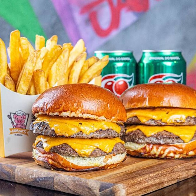O Cheese é a escolha perfeita para os amantes de hambúrgueres repletos de queijo! Comece com um pão brioche artesanal, que abraça um blend suculento de 130g cada, grelhados ao ponto ideal para preservar sua suculência. Cada camada de carne é coberta por uma deliciosa fatia de cheddar derretido, que envolve seu paladar com um sabor cremoso e irresistível. A cada mordida, você sentirá a combinação perfeita entre o sabor da carne e a riqueza do queijo. Se você não resiste ao poder do queijo, o Duplo Cheese é a opção certa! Acompanha 2 Duple Cheese, mais batata frita com delicioso creme de cheddar e bacon crocante, e 2 refrigerantes lata.