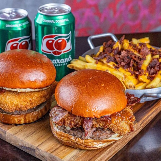 2 Graziô 1.0 - O hambúrguer dos apaixonados por sabores intensos! Nosso pão brioche macio abraça um blend exclusivo de 130g de carne suculenta, complementado por uma irresistível combinação de mussarela empanada crocante, geleia de pimenta adocicada e deliciosas fatias de bacon. Prepare-se para uma explosão de sabores em cada mordida! Acompanha batata frita com delicioso creme de cheddar e bacon crocante e 2 refrigerantes lata.