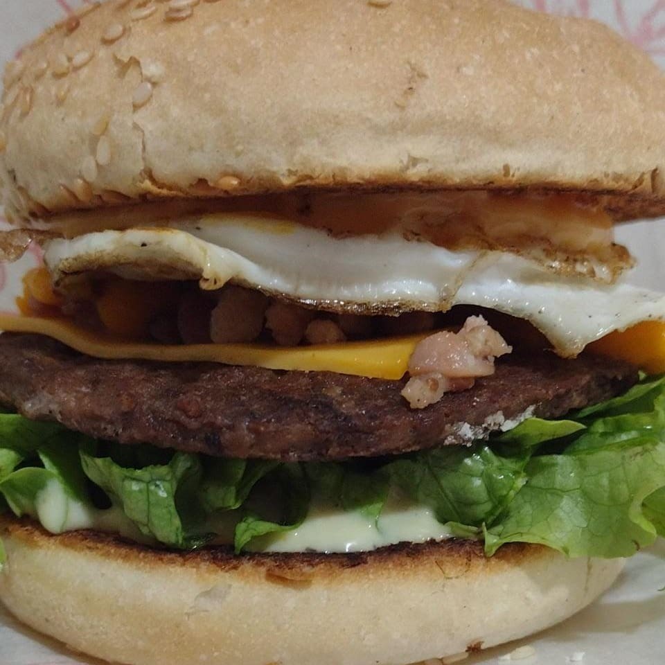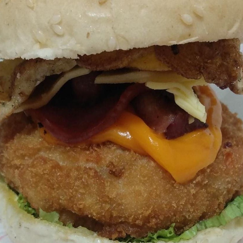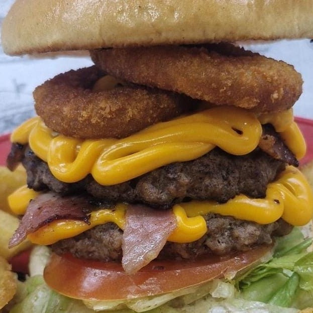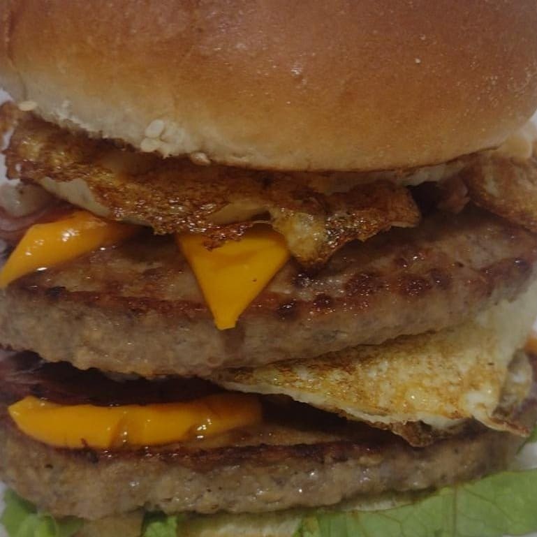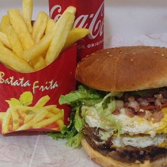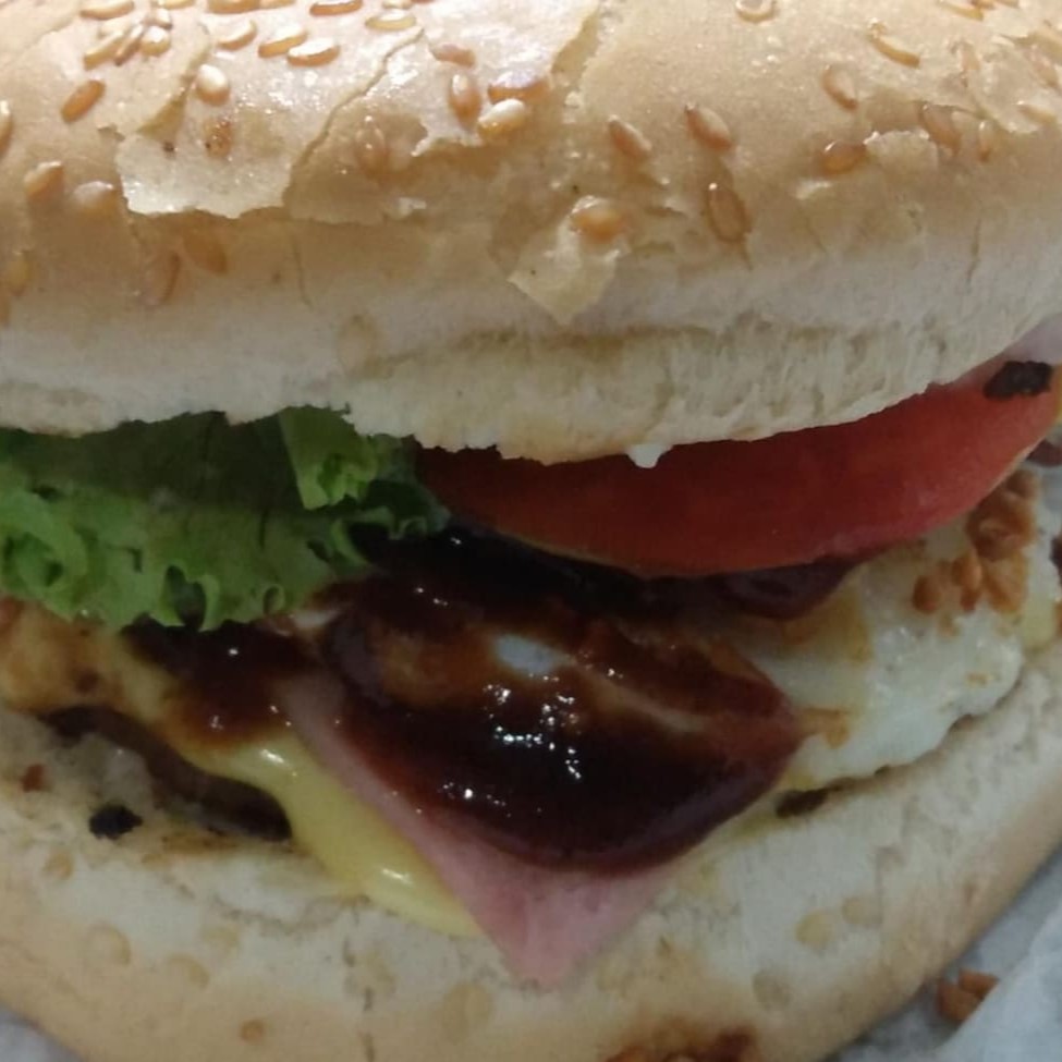 Pão, carne, ovo, queijo, bacon, 2 anéis de cebola, calabresa, alface, tomate, cebola, presunto e maionese da casa.