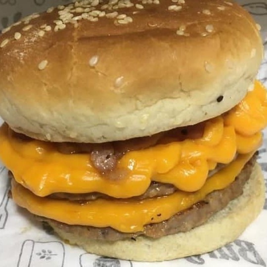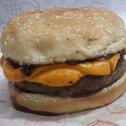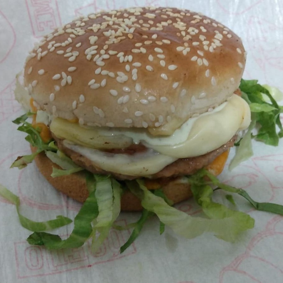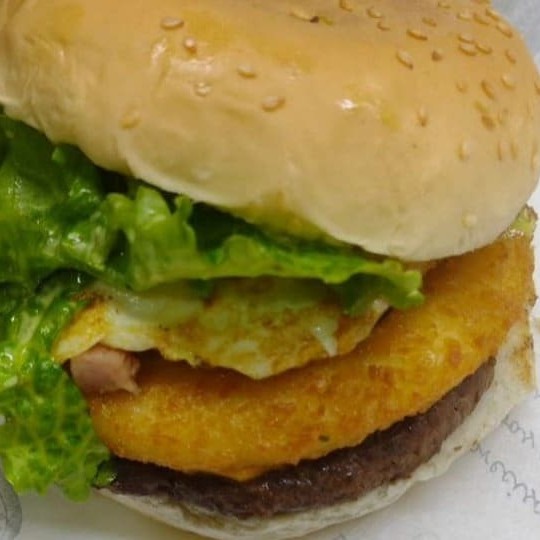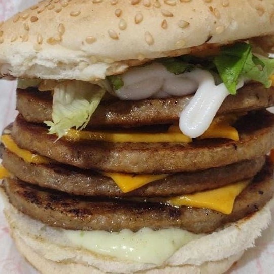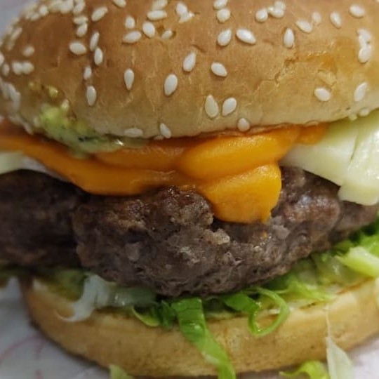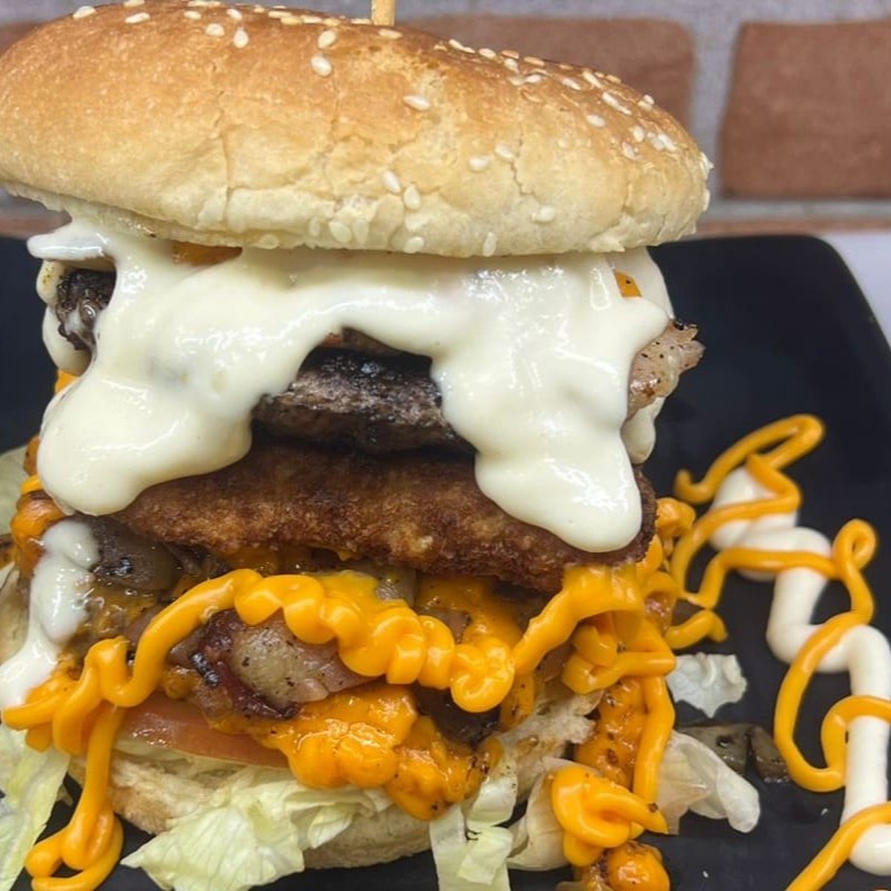 Pão, carne, ovo, queijo, bacon, 2 anéis de cebola, calabresa, alface, tomate, cebola, presunto e maionese da casa.