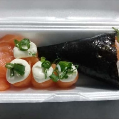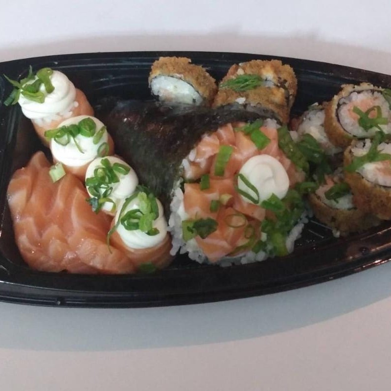 1 Temaki Filadélfia, 2 Harumakis Salmão, 3 Sashimis, 4 Joe Joes +2 Sachês Shoyu