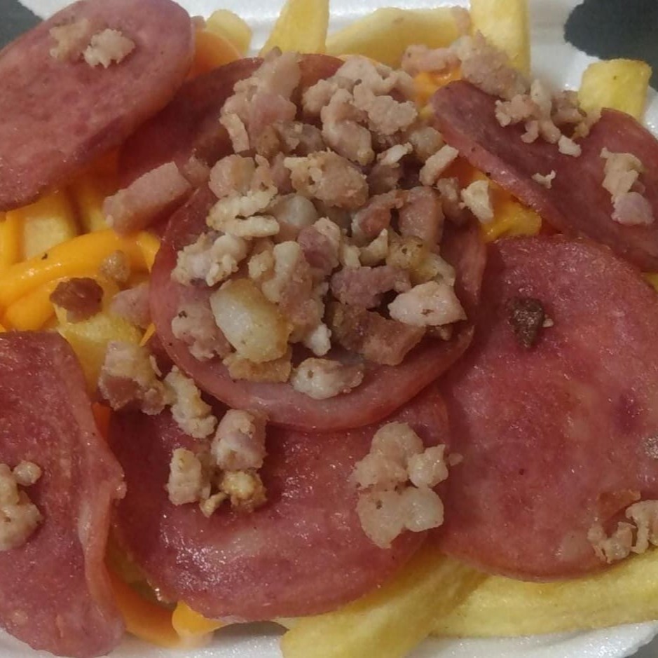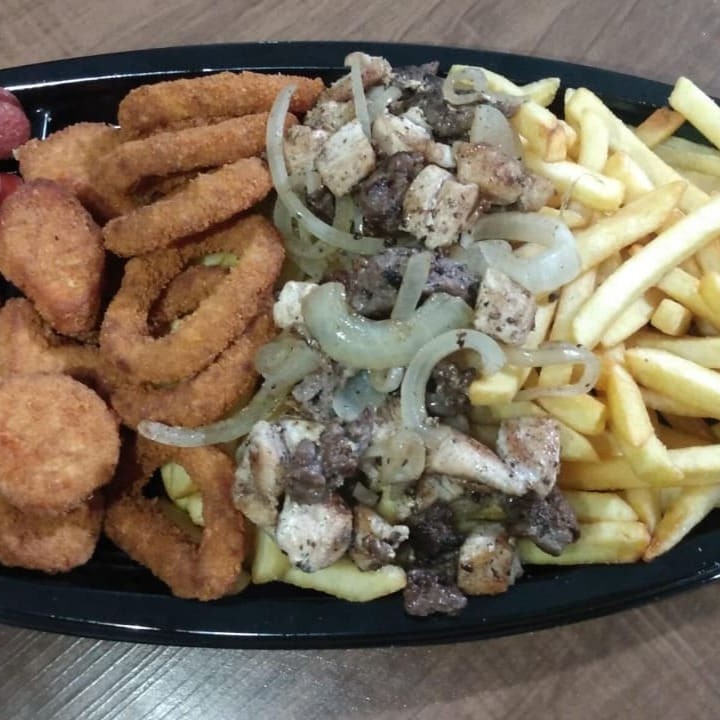 Pão, carne, ovo, queijo, bacon, calabresa, alface, tomate, cebola, presunto, Catupiry e maionese da casa.