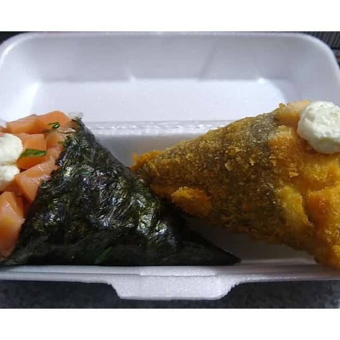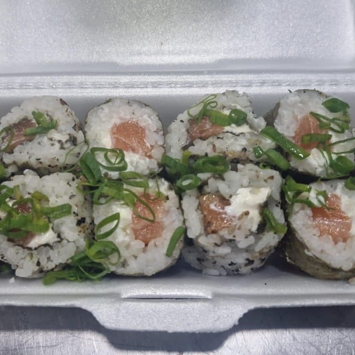 Alga, arroz, cream cheese, salmão e cebolinha.
