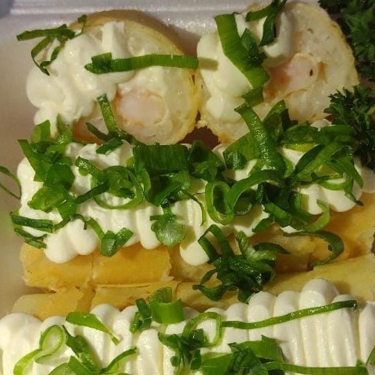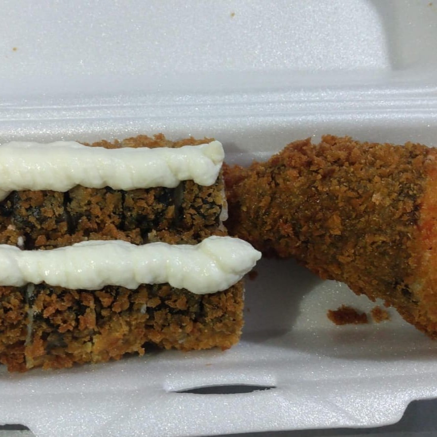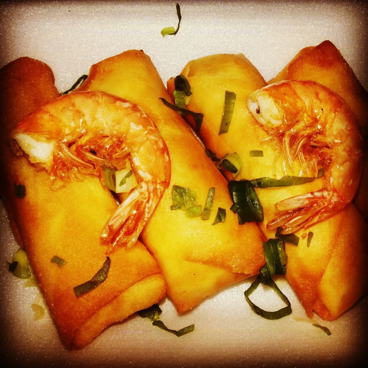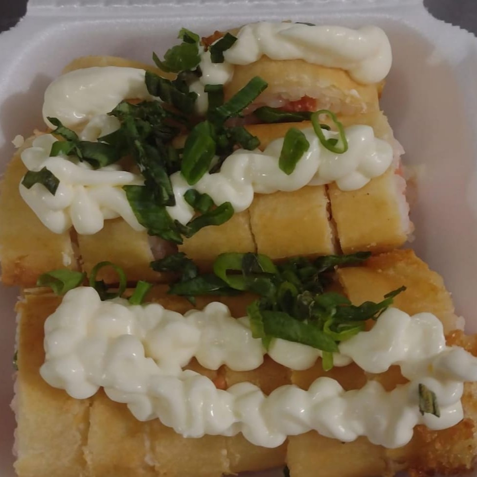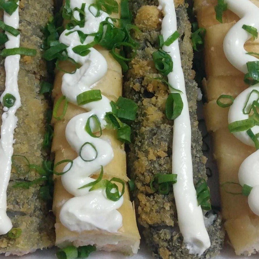 Massa de harumaki, arroz, cream cheese, camarão enrolados e fritos. Com cebolinha e cream cheese por cima.