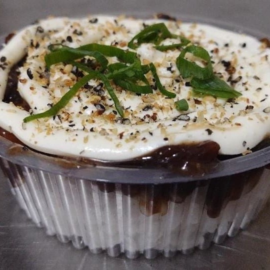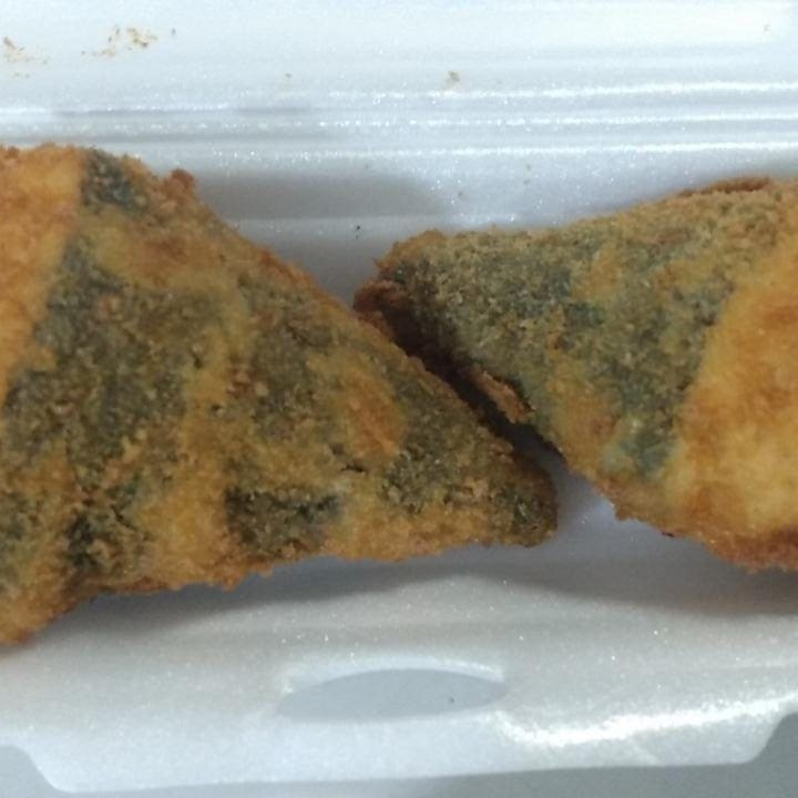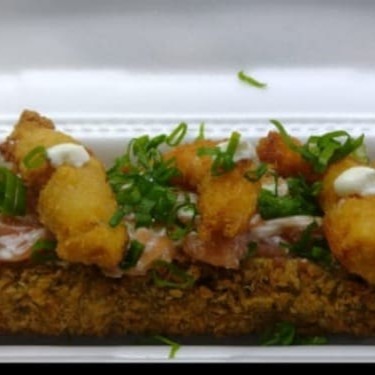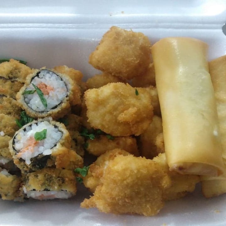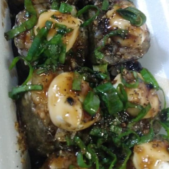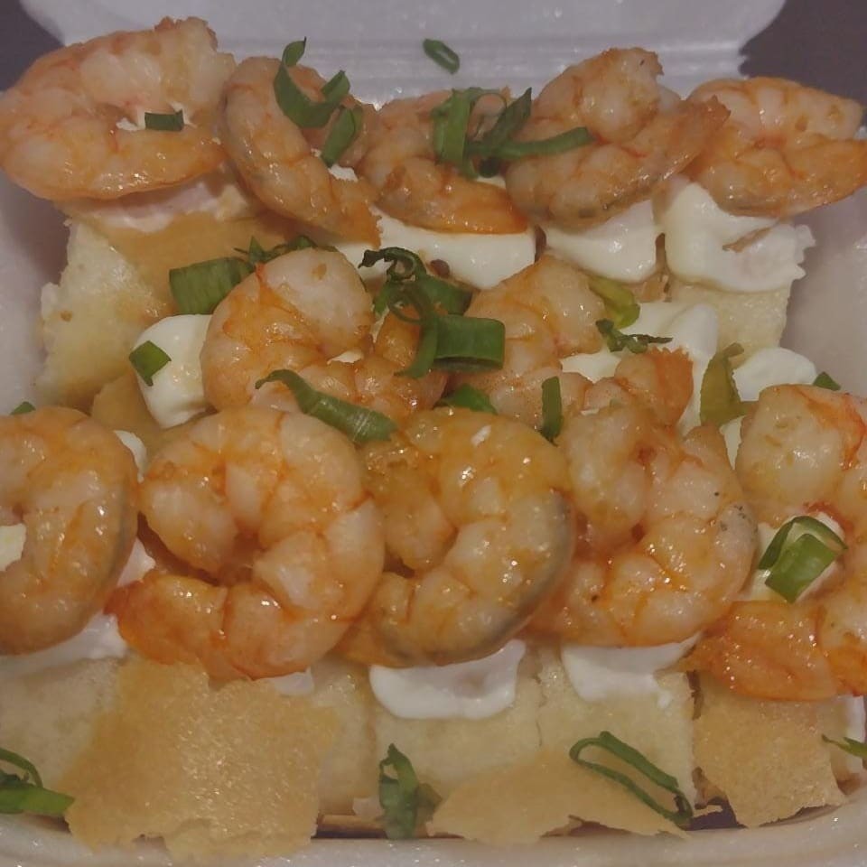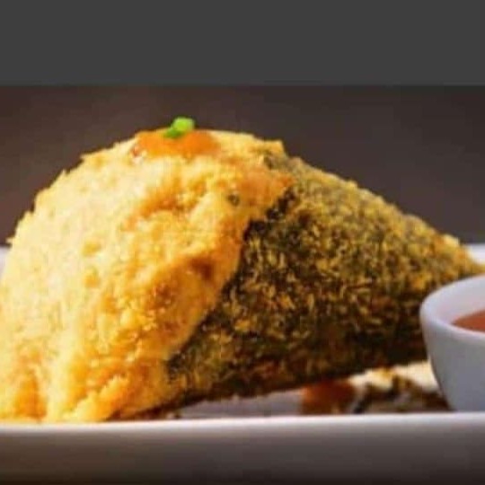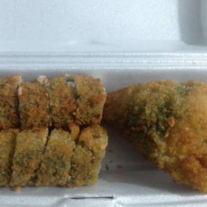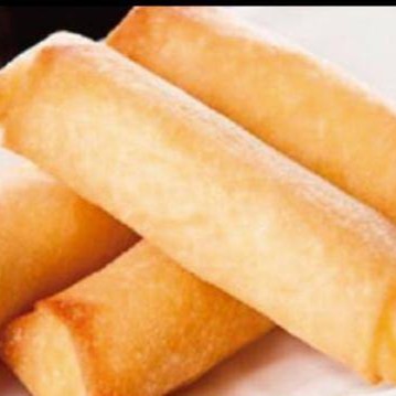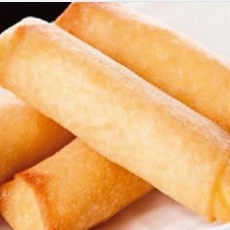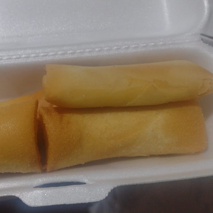 Massa de harumaki, arroz, cream cheese, camarão enrolados e fritos. Com cebolinha e cream cheese por cima.