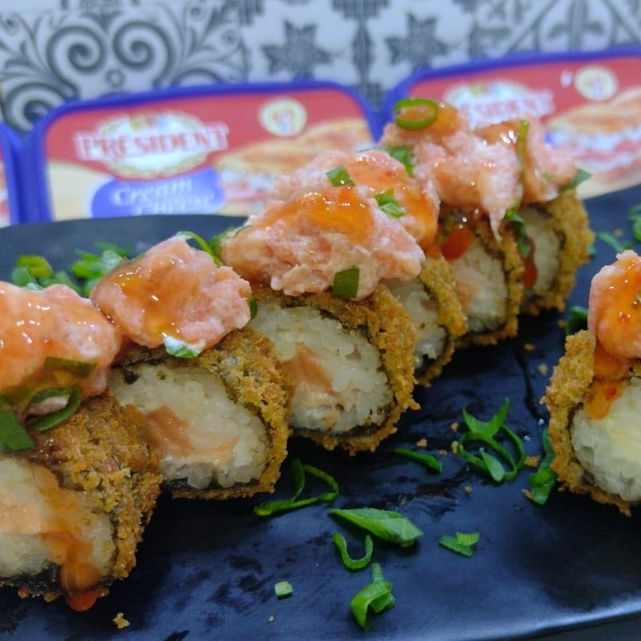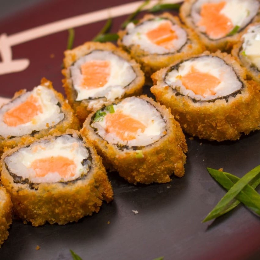Massa do harumaki enrolada e frita com arroz, cream cheese, cebolinha e salmão. Cream cheese e cebolinha por cima.