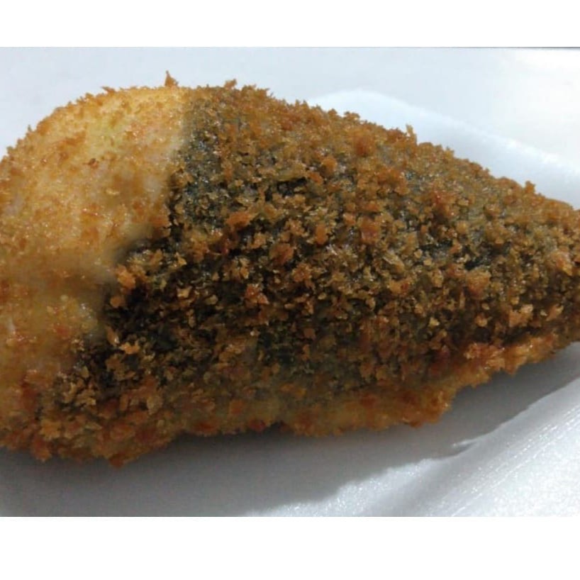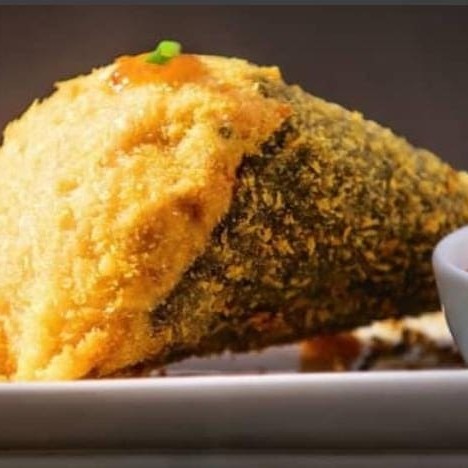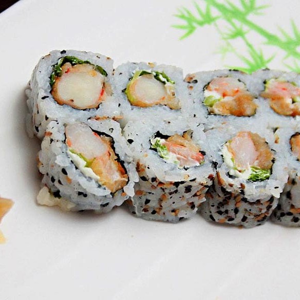 Arroz por fora com gergelim enrolado com alga, camarão, cream cheese e cebolinha.