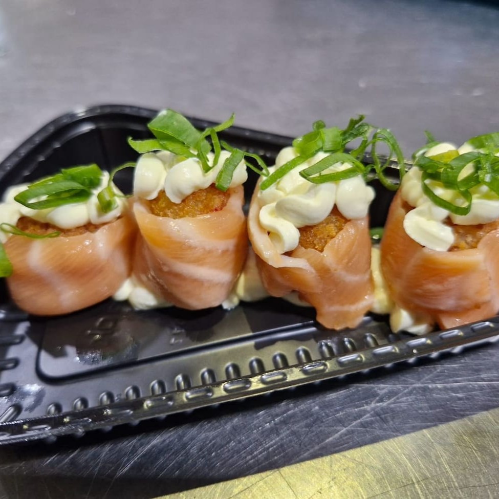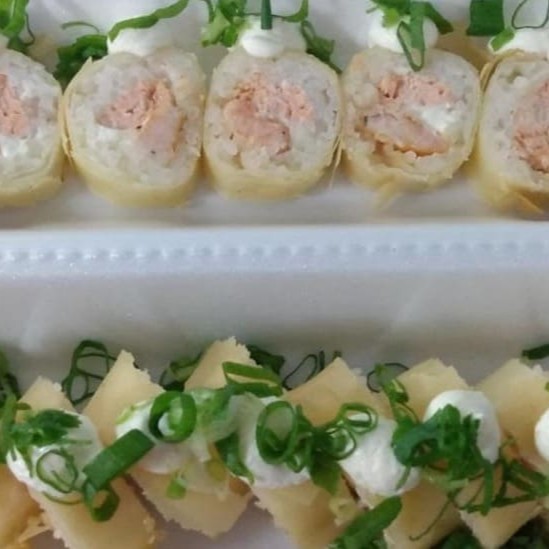 Salmão e camarão com cream cheese, envoltos com arroz na folha de rolinho primavera, com cebolinha e cream cheese por cima
