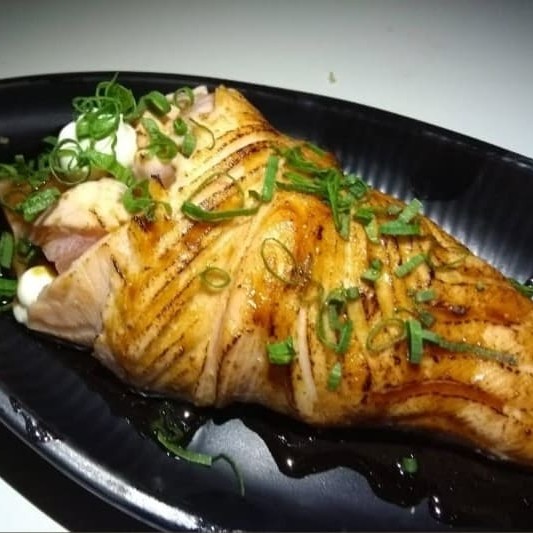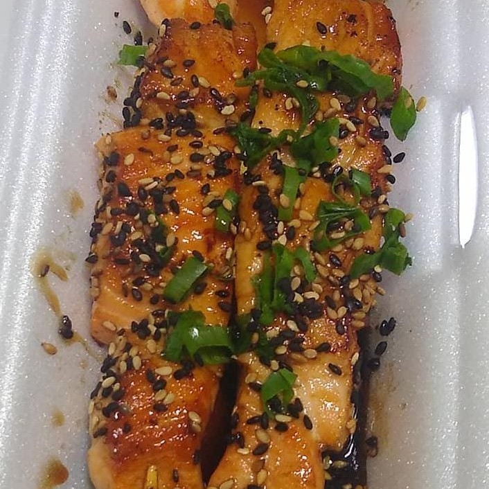2 espetos com 4 cubos de salmão em cada, molho do chef, cebolinha e gergelim torrado.