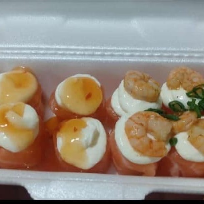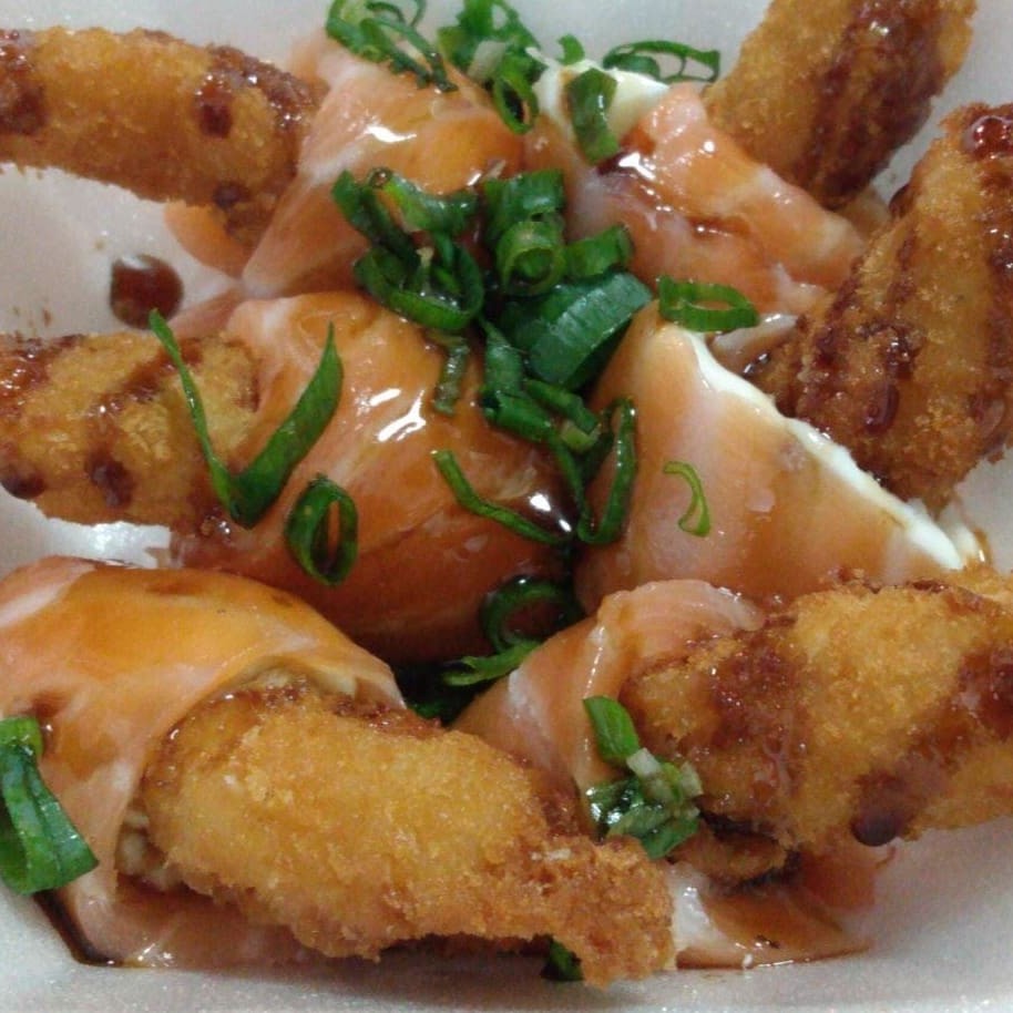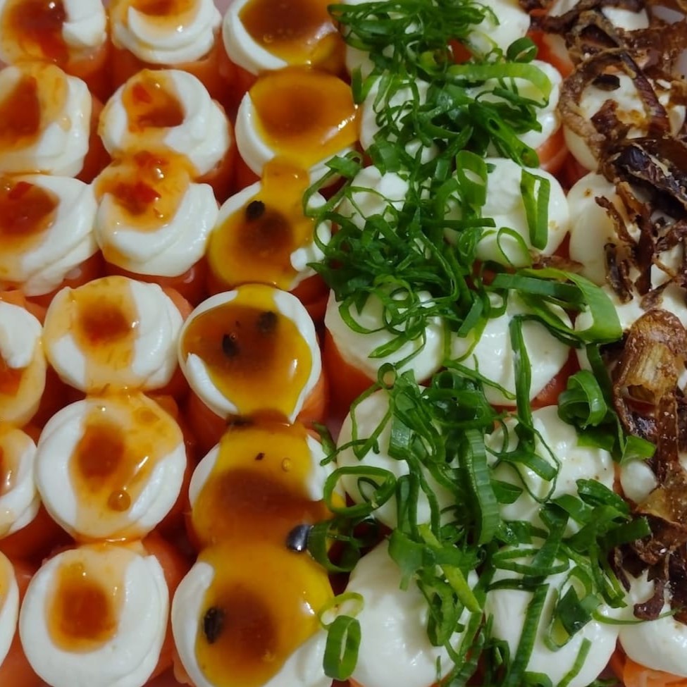 Deliciosas peças de haru hot de salmão com cream cheese e camarão fritinho por cima e cebolinha