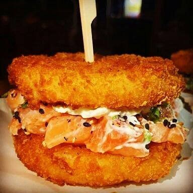 Massa do harumaki enrolada e frita com arroz e salmão. Sem cream cheese e sem cebolinha.