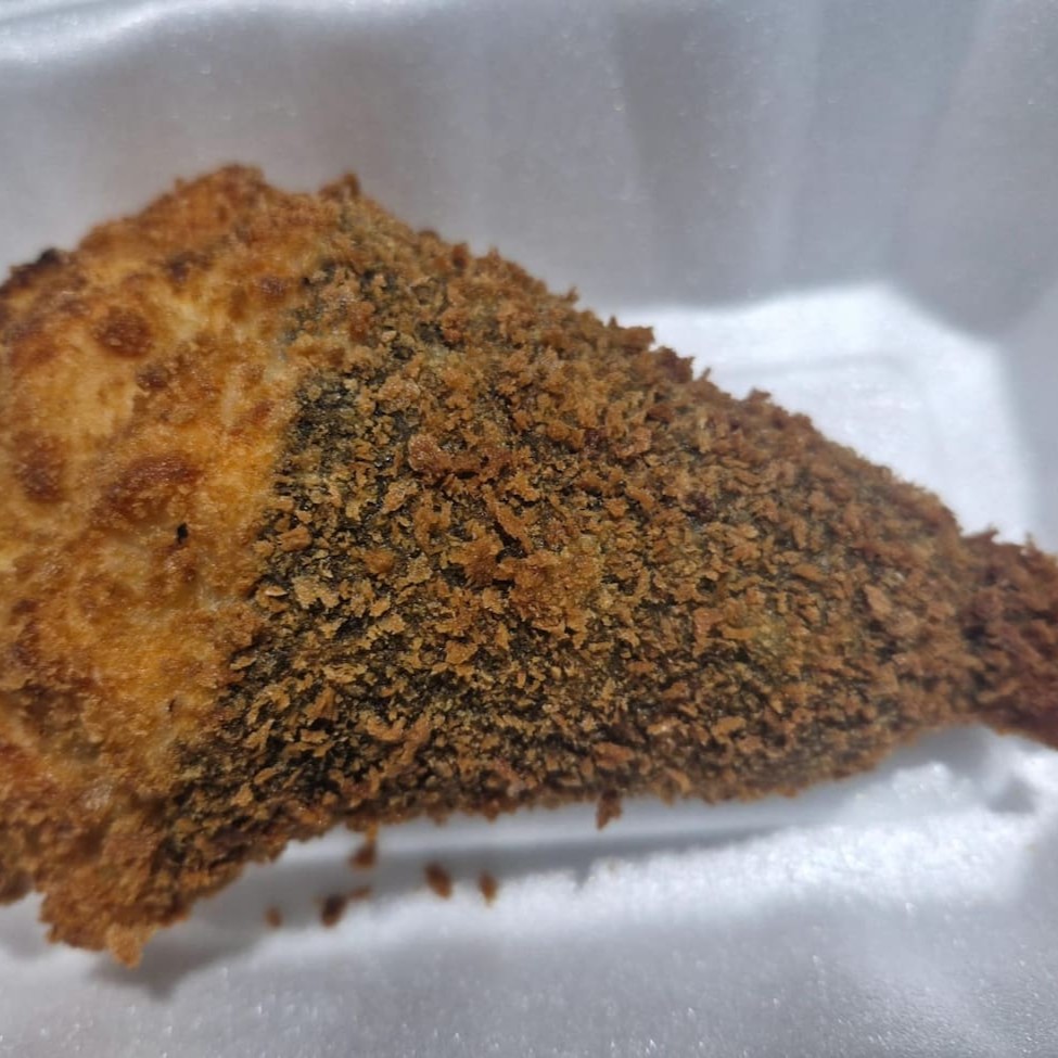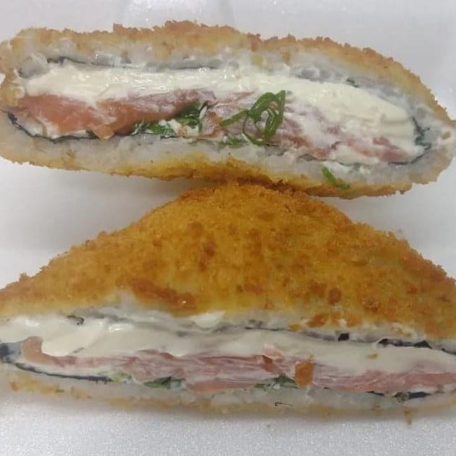 Hot filadélfia cortado ao meio com recheio de salmão, cream cheese e cebolinha.