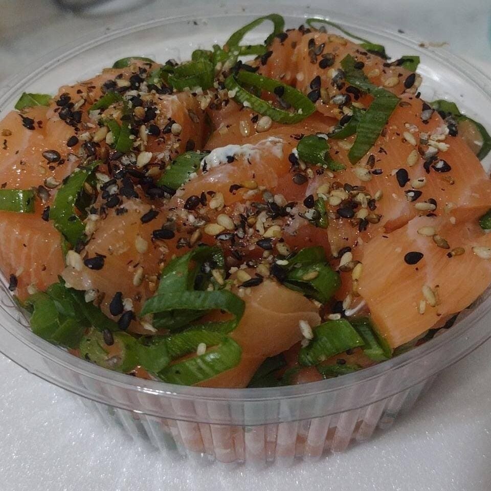 Salmão fresco, enrolado com arroz, cebolinha e gergelim.