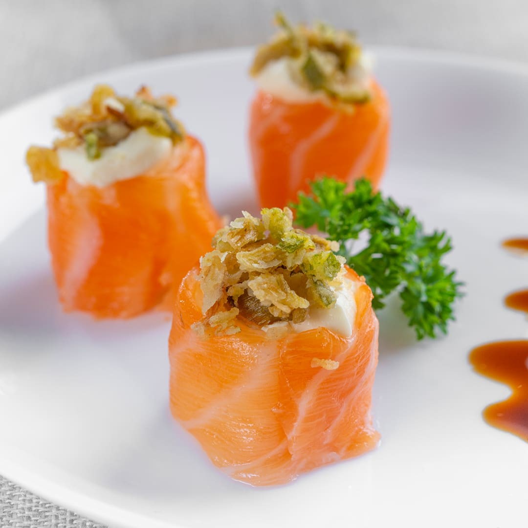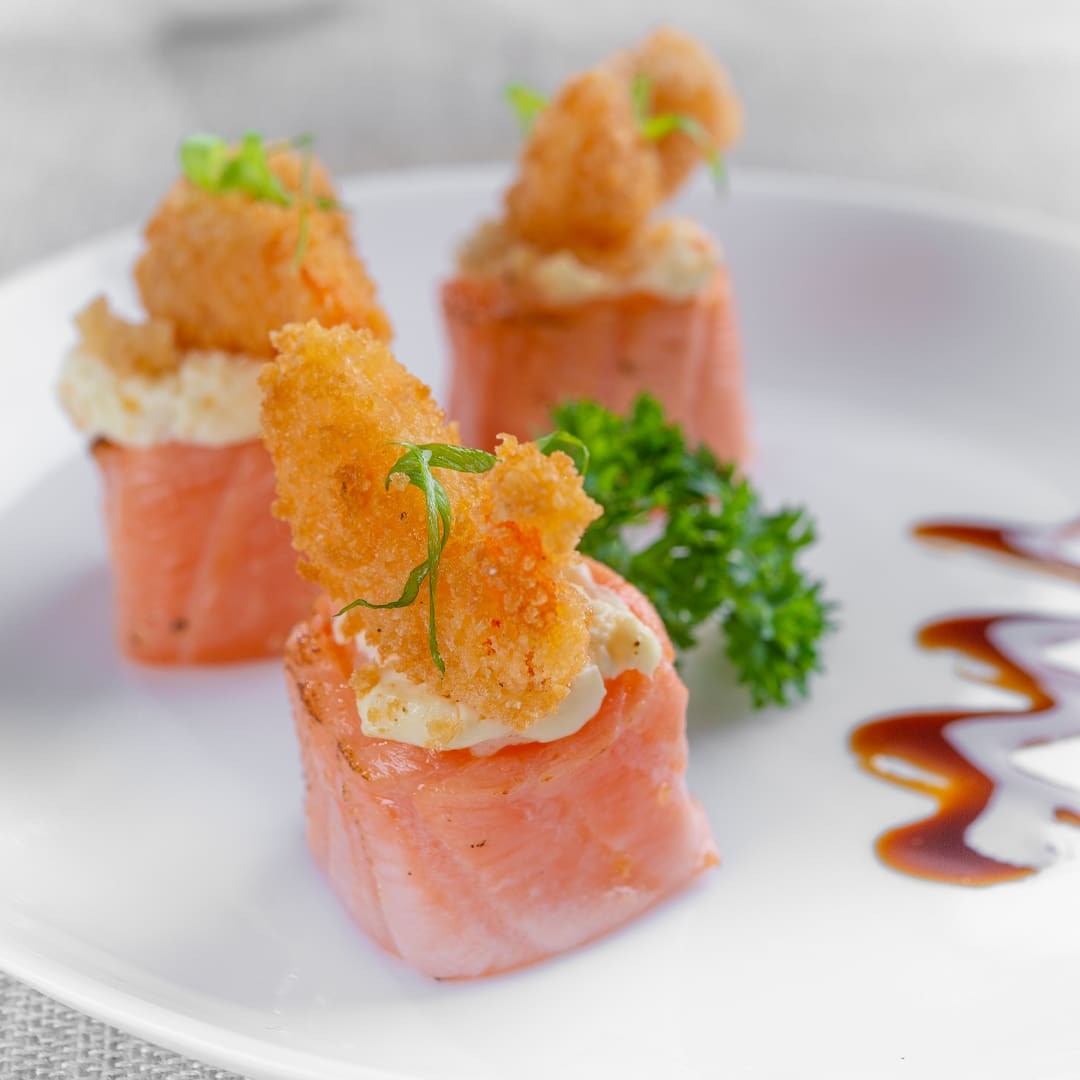 Lâminas de salmão enrolado no cream cheese e camarão empanado