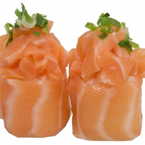 Hot com arroz, salmão, cream cheese e cebolinha, com salmão cru picado por cima em cada unidade