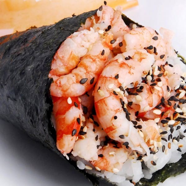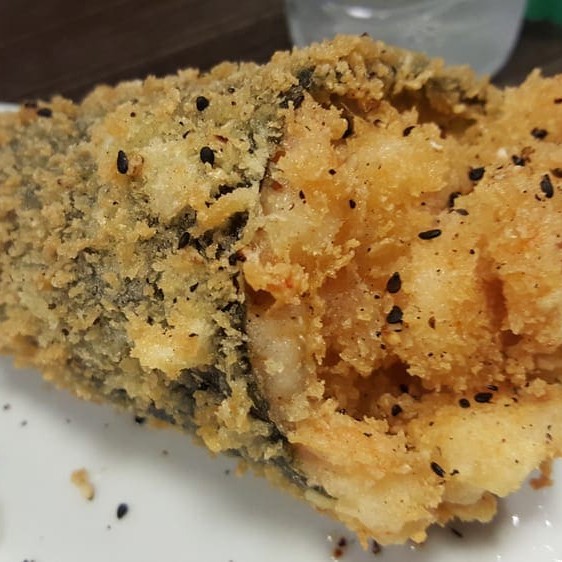 Hot de camarão empanado na farinha panko, enrolado na alga com arroz, cream cheese e cebolinha
