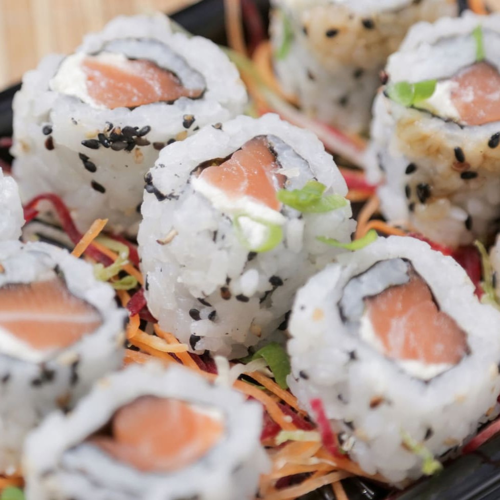 Roll com arroz, salmão, cream cheese, cebolinha e alho poro frito por cima de cada unidade