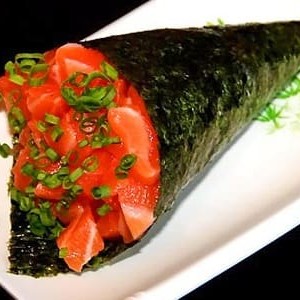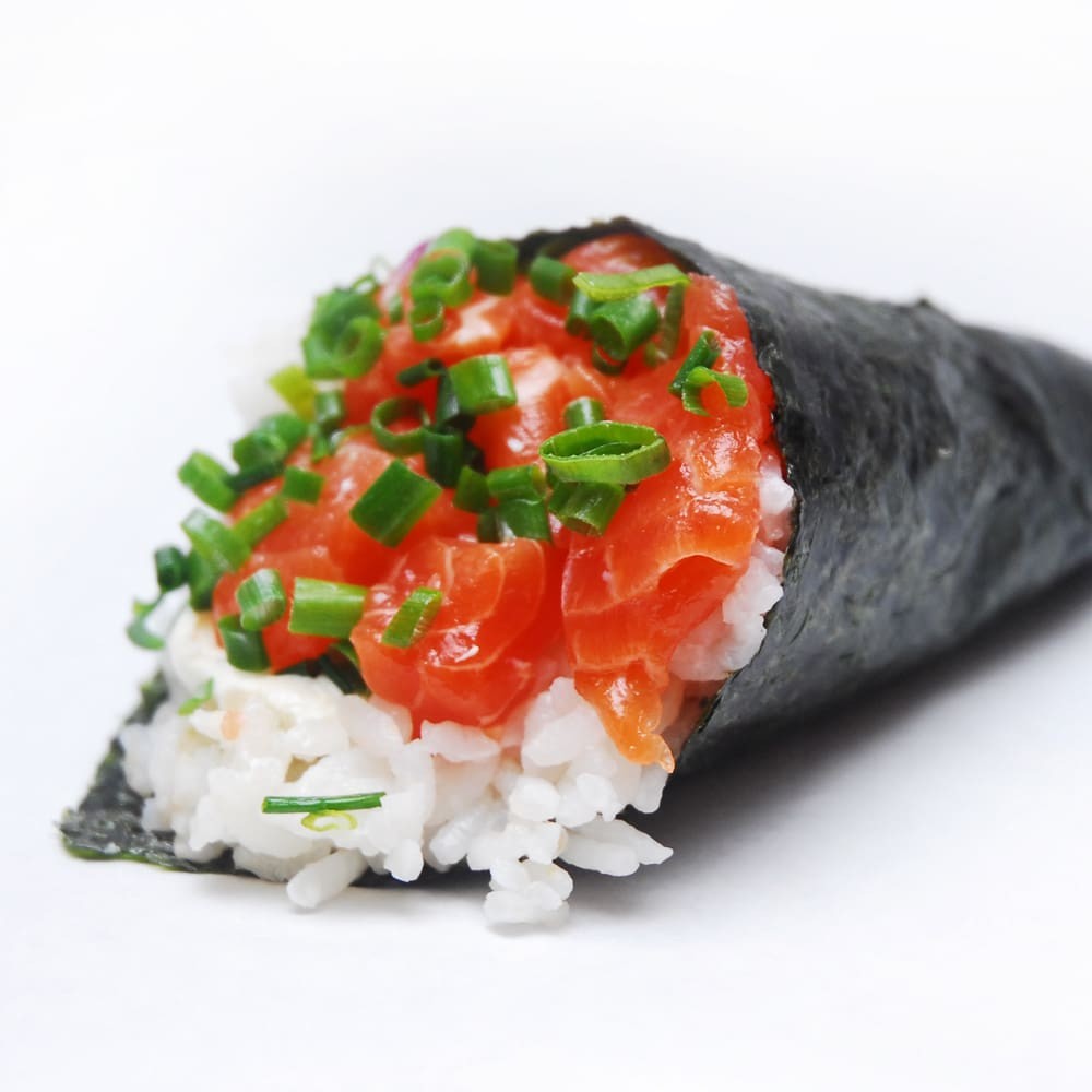 Temaki de salmao com arroz, cream cheese, cebolinha e geléia de pimenta bem Picante.