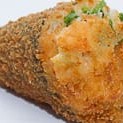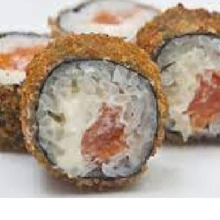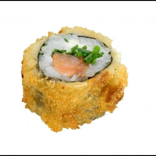 Base com alga e arroz empanado na farinha panko e frito, recheado de cream cheese, salmão em cubos, cebolinha, teriaki, Gergelim moido e Alho poro