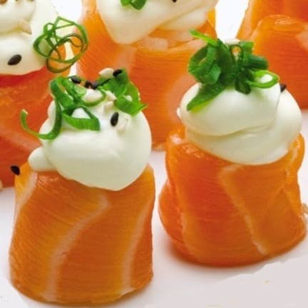 Lâminas de salmão enrolado no cream cheese com camarão por cima