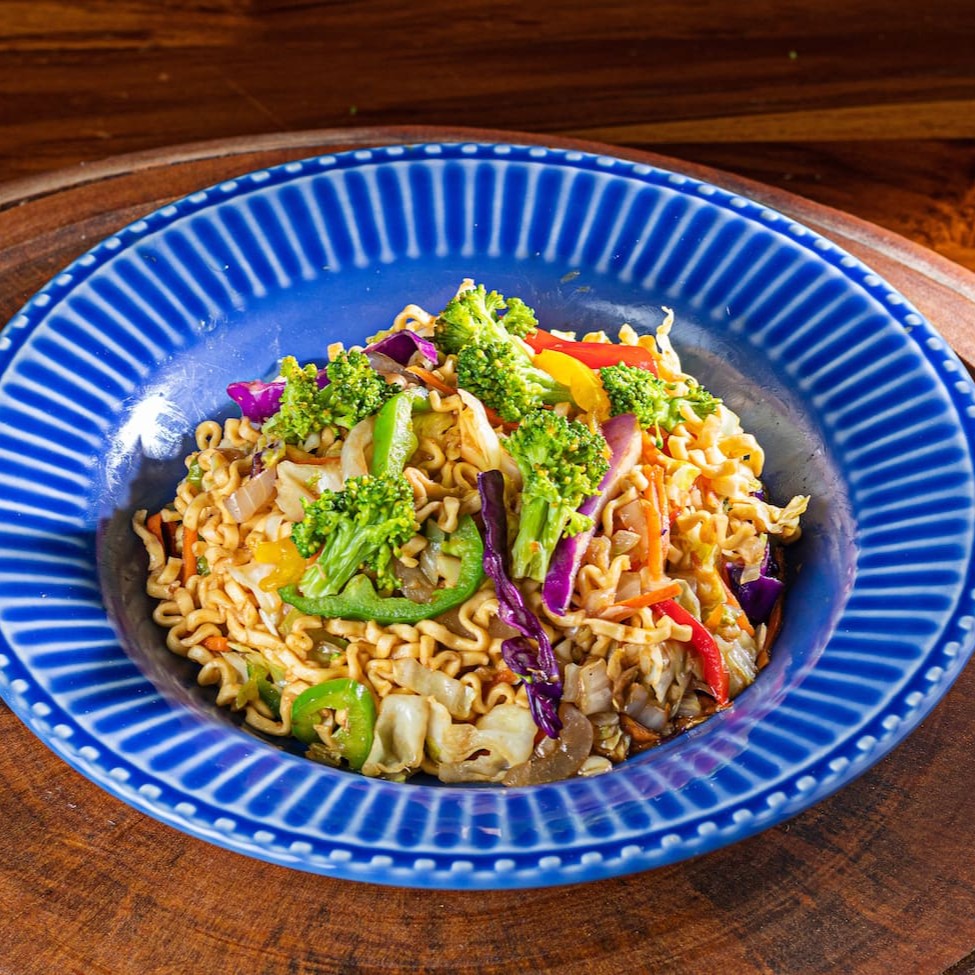 Macarrão oriental, preparado com legumes, shoyo e molho tonkatsu.