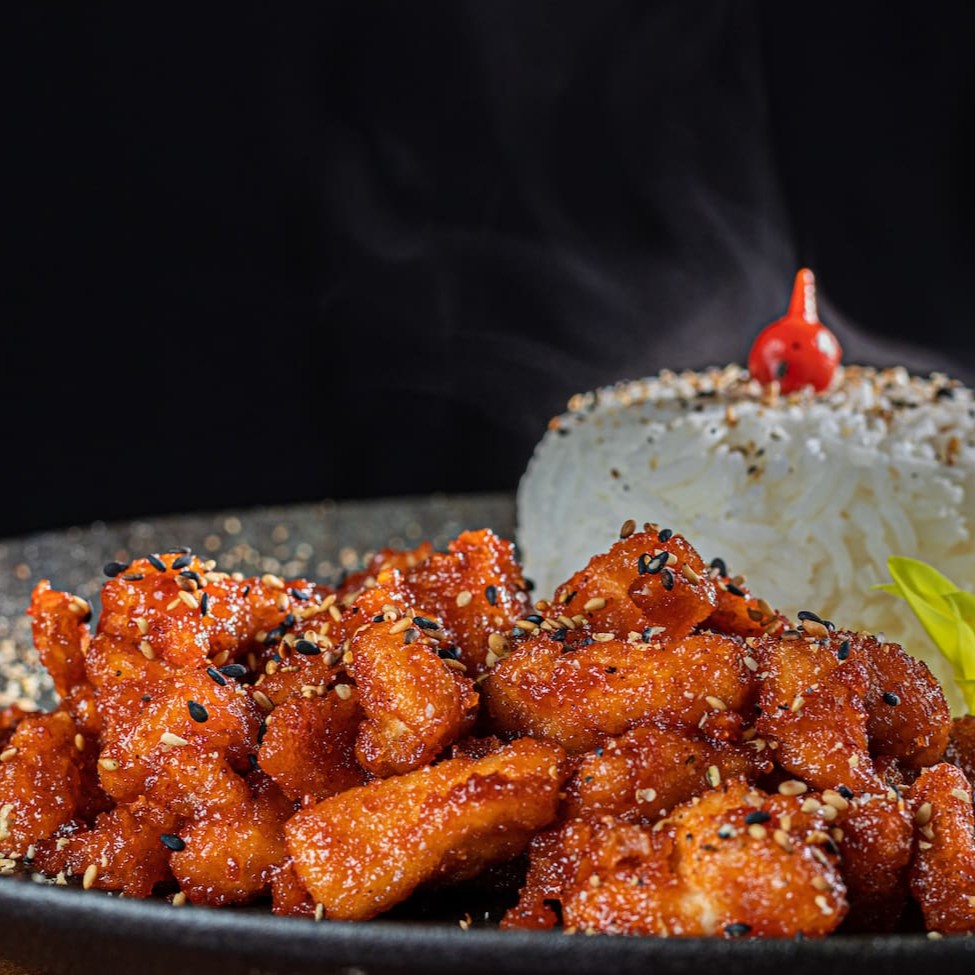 Cubos de carne de 1ª, grelhados no espeto com fios de molho teriyaki.