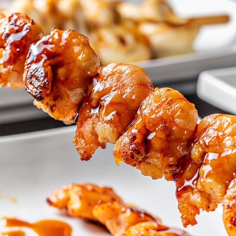 Camarões grelhados no espeto, com fios de molho teriyaki.