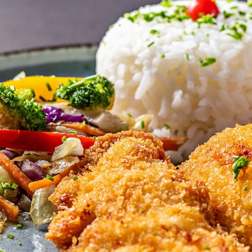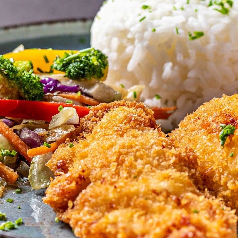 Filé de frango empanado na farinha panko, acompanhado de arroz e salada de legumes.