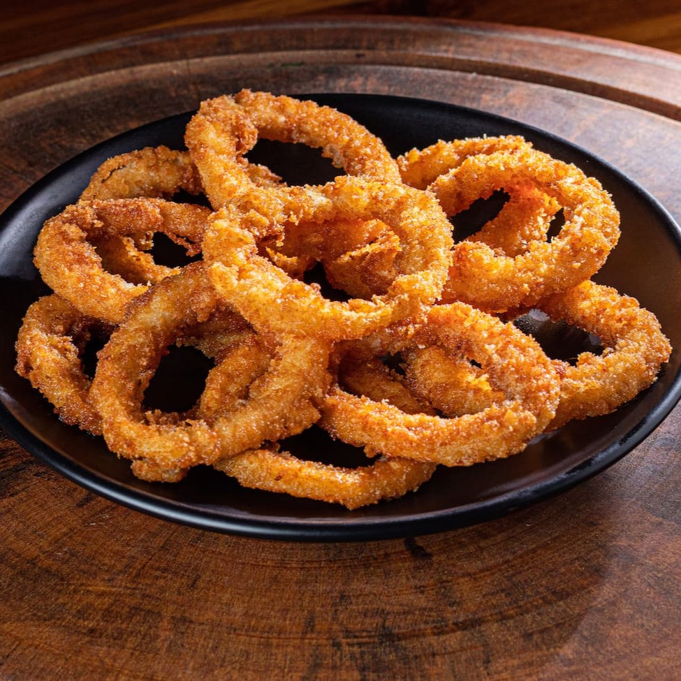 Rodelas de cebola empanadas na farinha panko, acompanhadas por molho tarê.