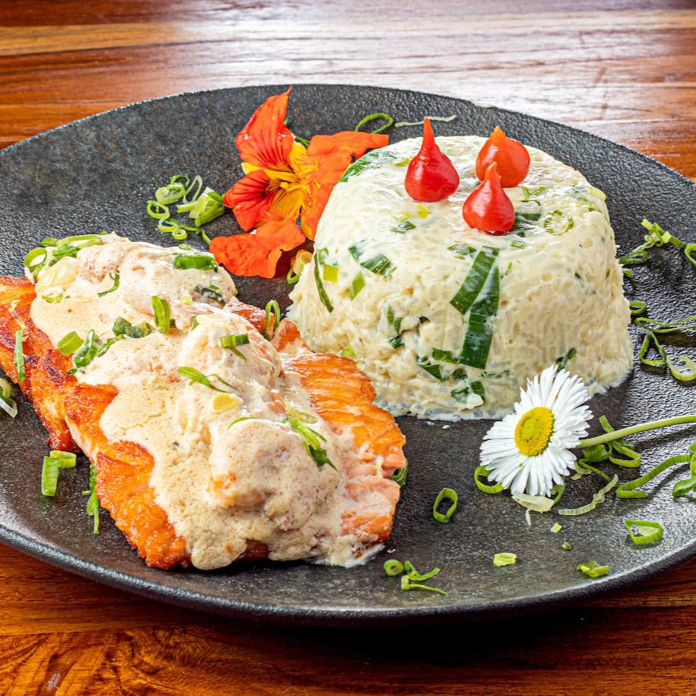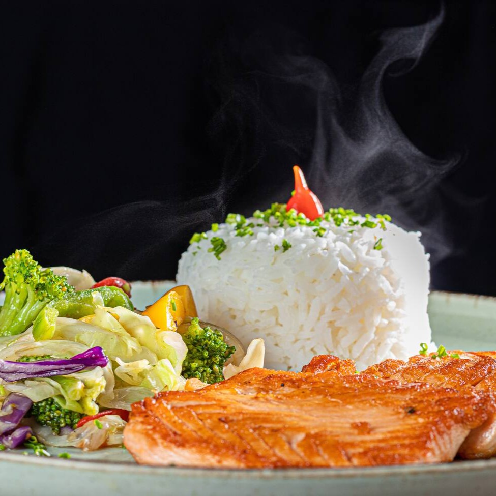Salmão grelhado, acompanhado de arroz e salada de legumes ou yakissoba de legumes.