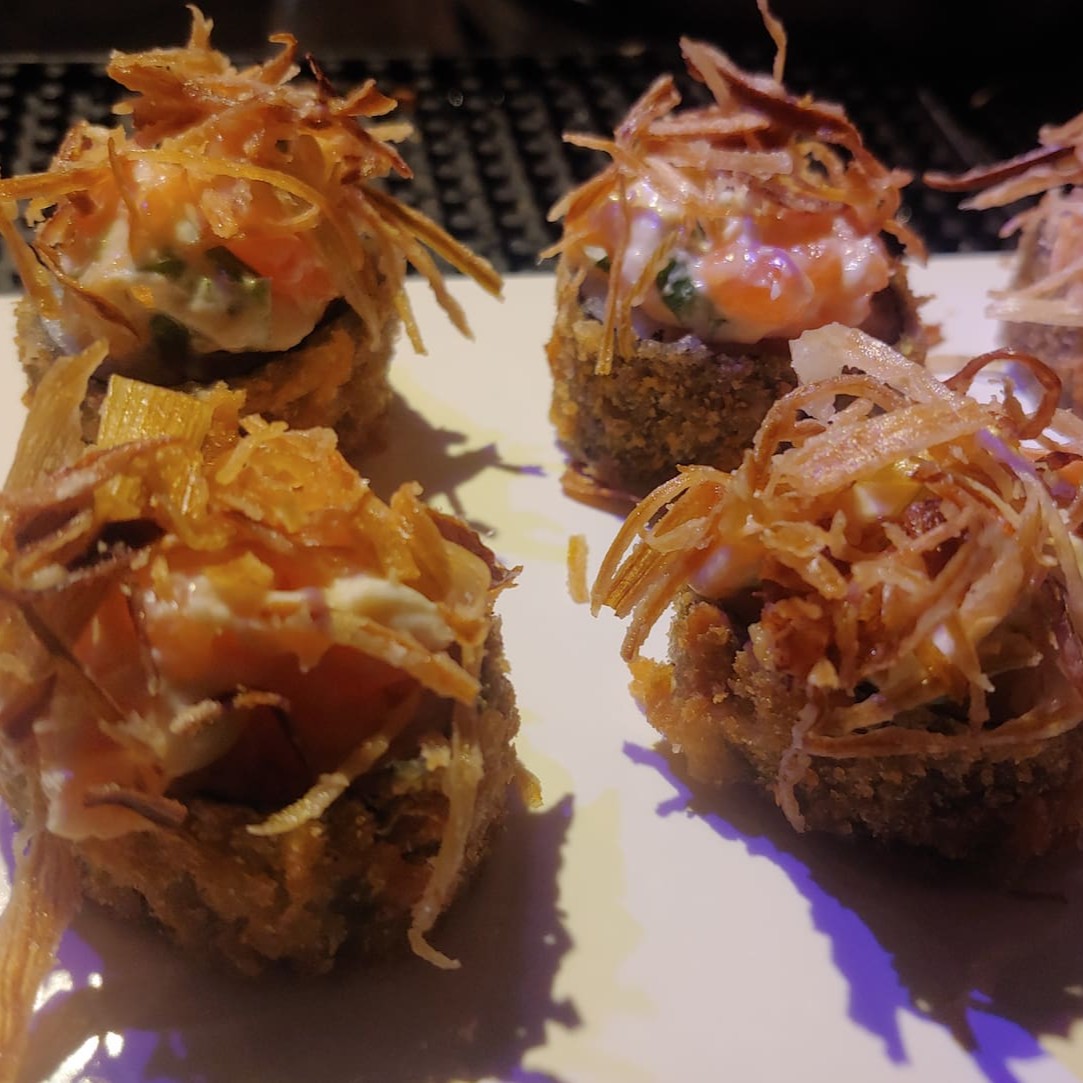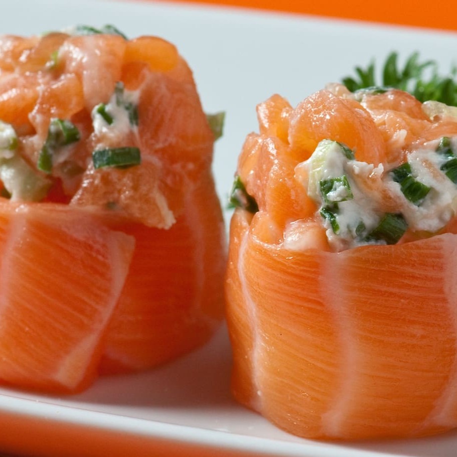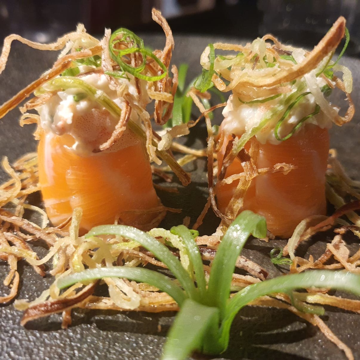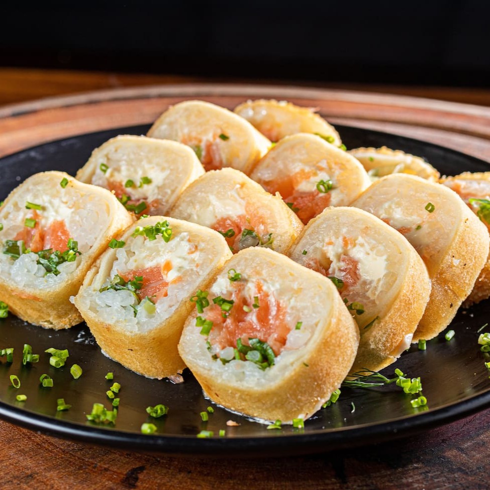 Rolinhos de massa crocante recheados com salmão, requeijão e cebolinha. Rolinho primavera.