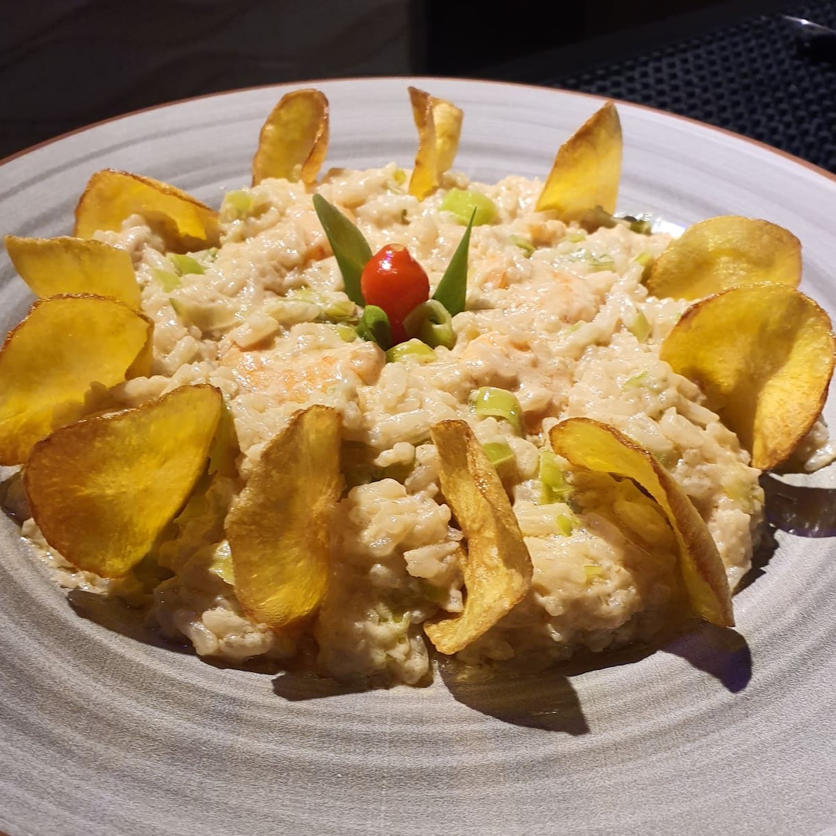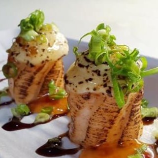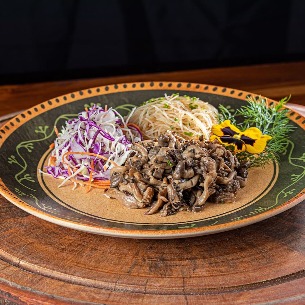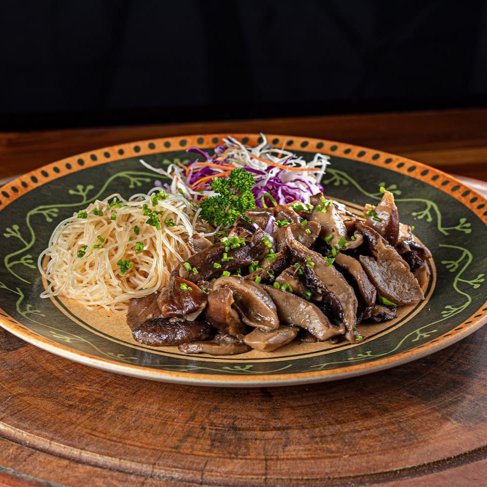 Cogumelos grandes refogados na manteiga, acompanhados de bifum frito. Produto sazonal.