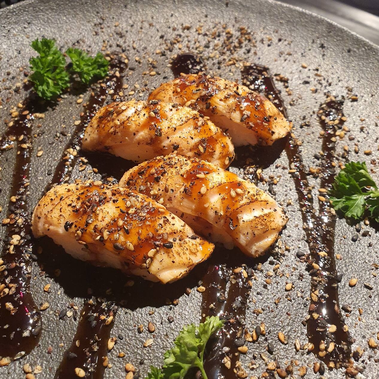 Lâminas de salmão envoltas em uma crosta de gergelim.