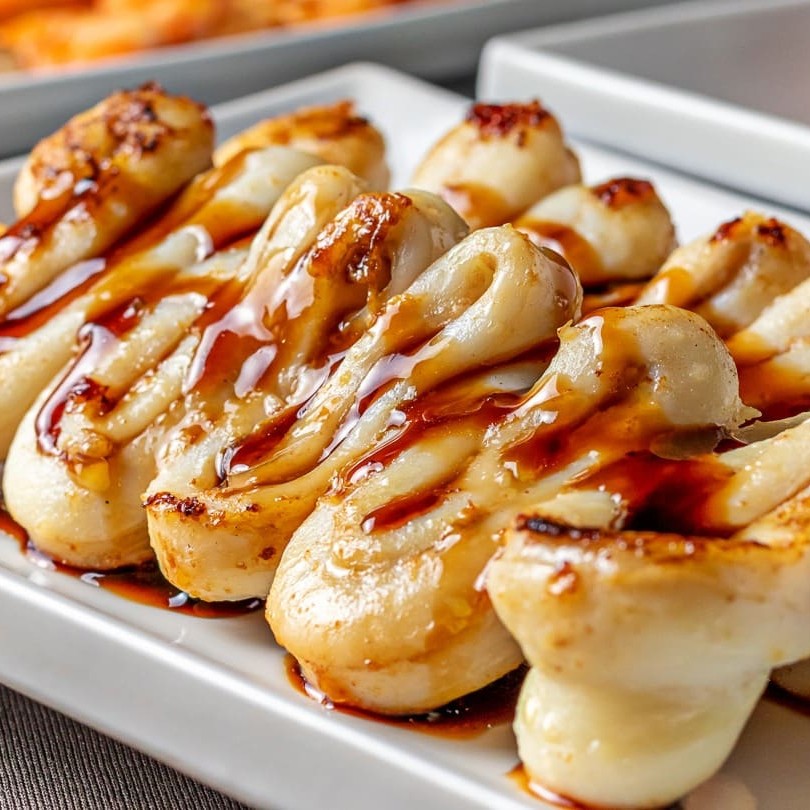 Anéis de lula grelhados no espeto, com fios de molho teriyaki.