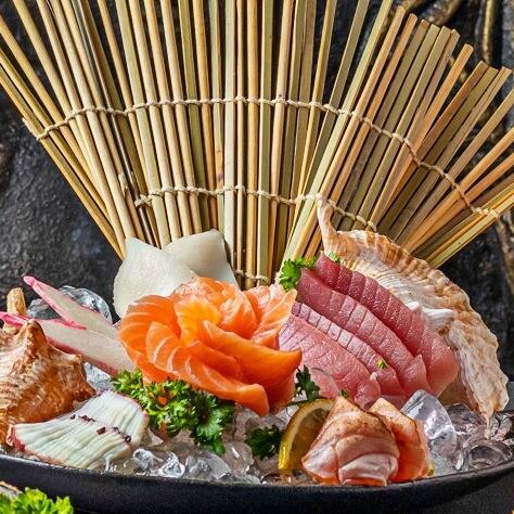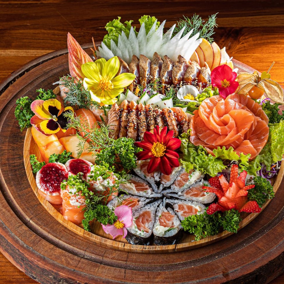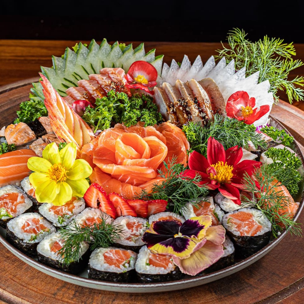 Sashimis (14 salmão, 8 atum, 8 peixe branco, 4 salmão roast, 4 atum roast), Sushis (6 salmão, 4 atum, 4 peixe branco, 4 Camarão, 2 polvo, 2 kani), Maki Rolls (4 califórnia, 4 skin, 12 hot filadelfia, 12 hot ebi).
