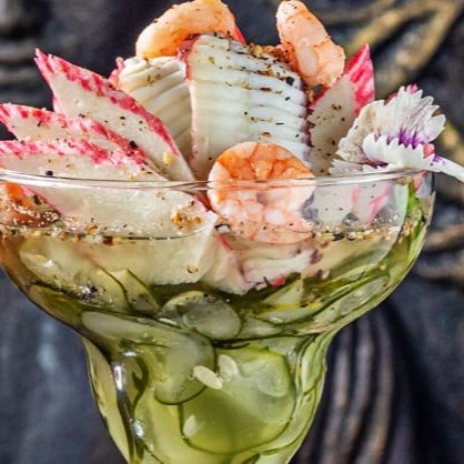Salada de lâminas de pepino japonês ao molho vinagrete, acompanhada de kani, camarão e polvo.