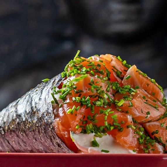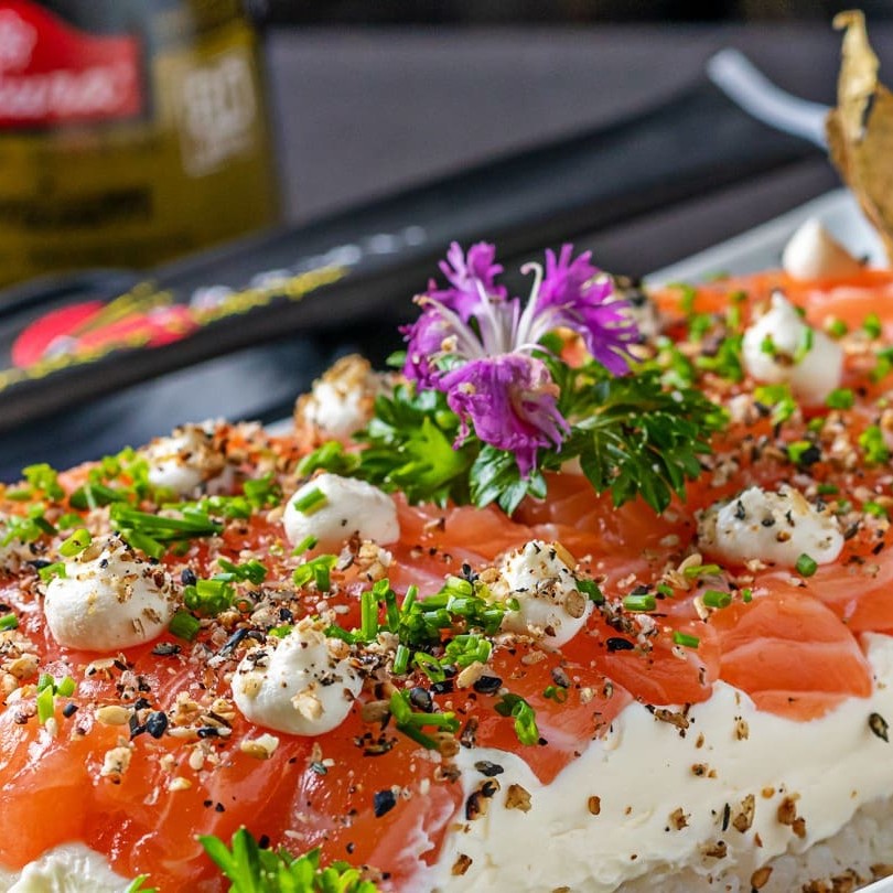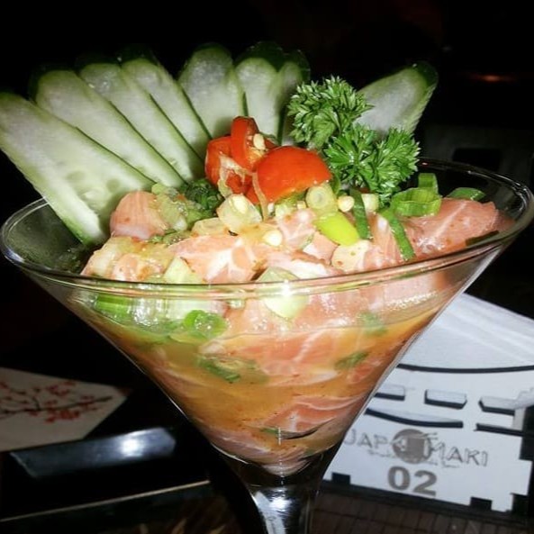 Cubos de Salmão marinados com Limão, Laranja, Cebola Roxa e Togarashi