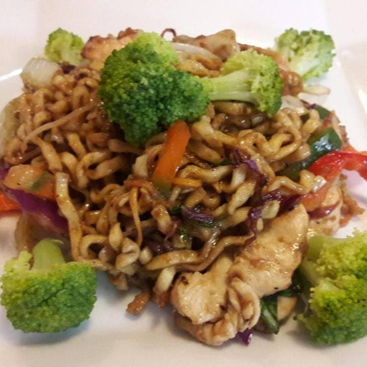 Macarrão oriental, preparado com frango, legumes, shoyo e molho tonkatsu.