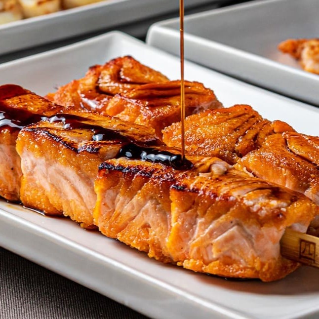 Cubos de salmão grelhados no espeto, com fios de molho teriyaki.