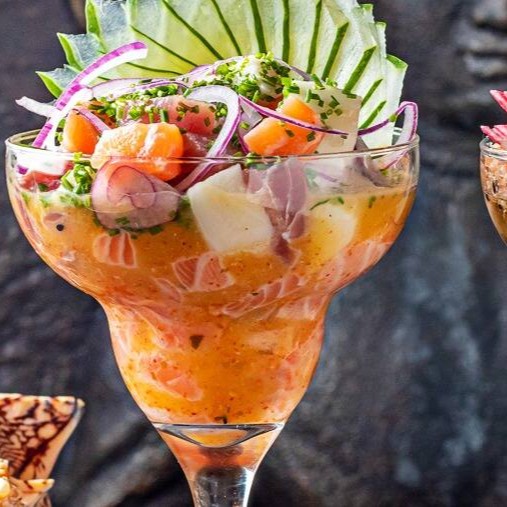 Cubos de Salmão e Atum marinados com Limão, Laranja, Cebola Roxa e Togarashi.