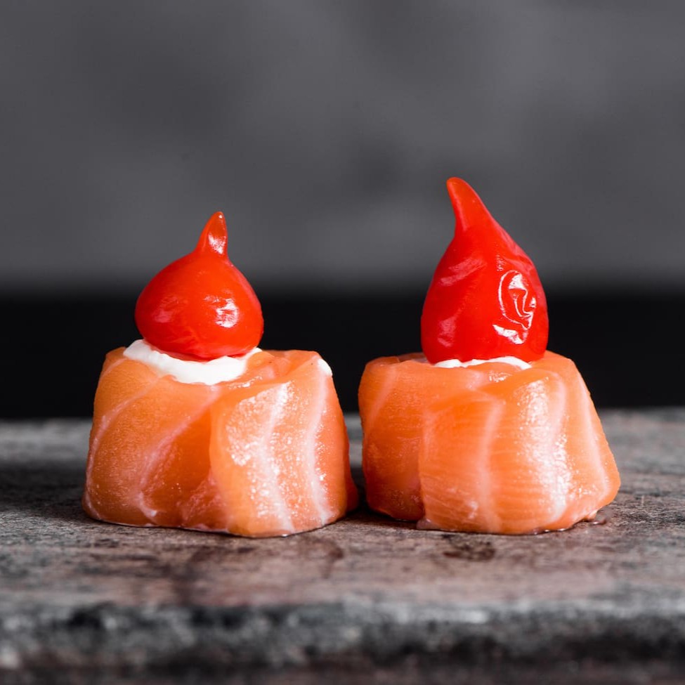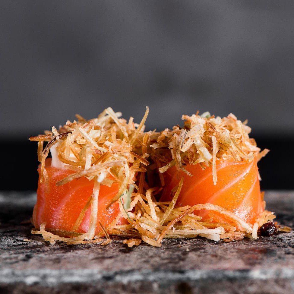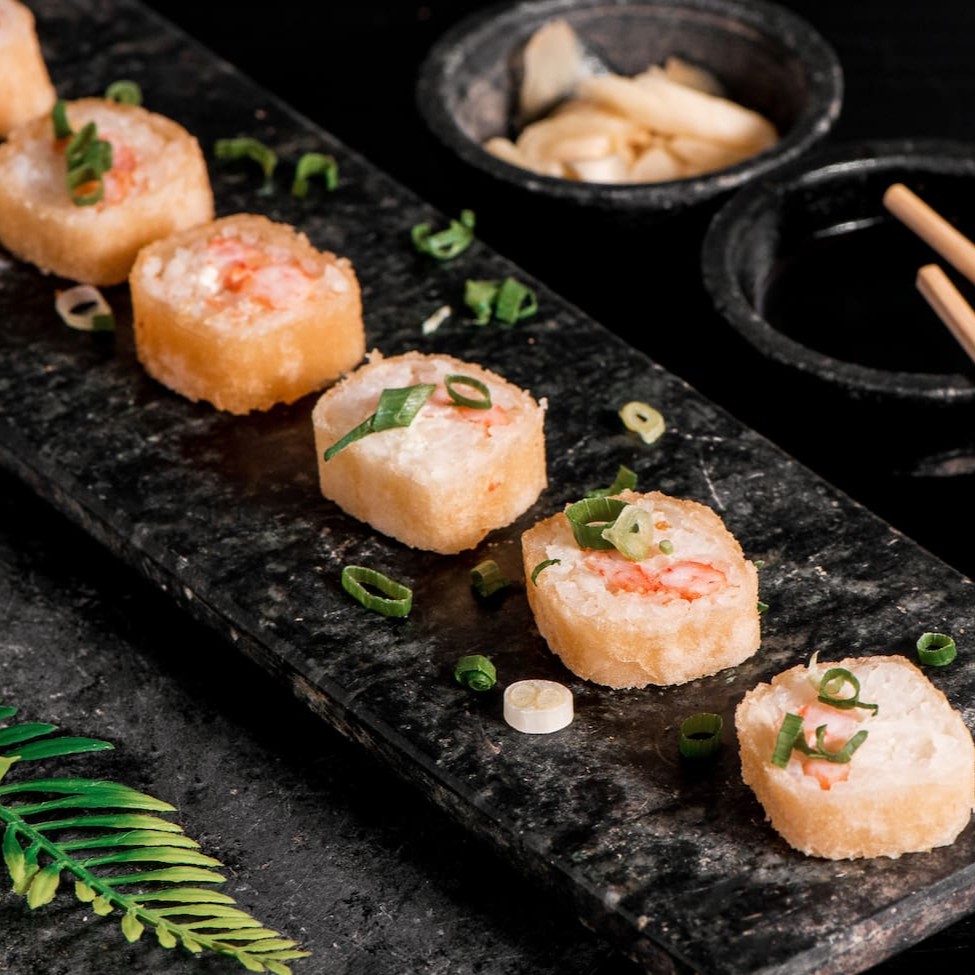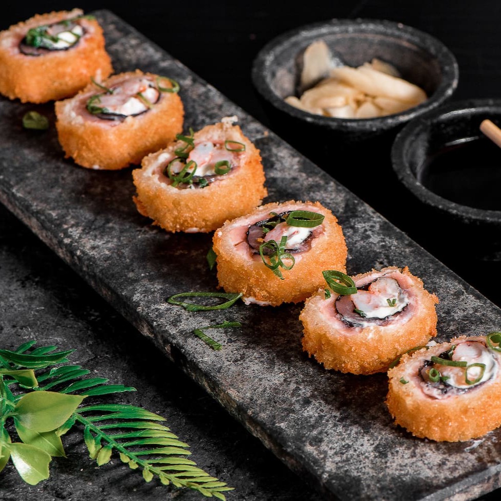 Arroz, salmão e cream cheese enrolado na casquinha do harumaki e frito