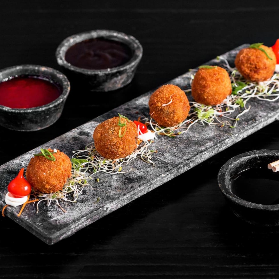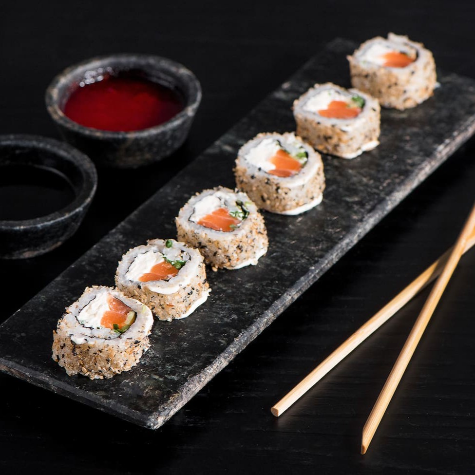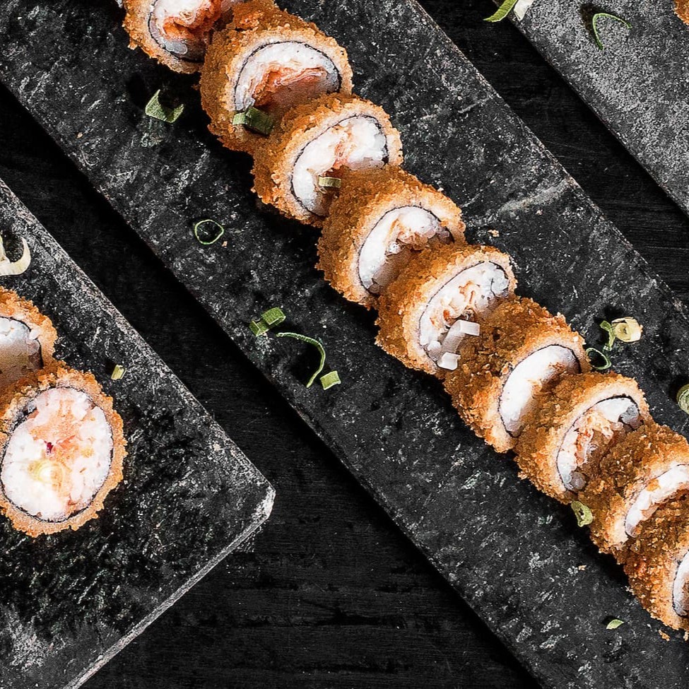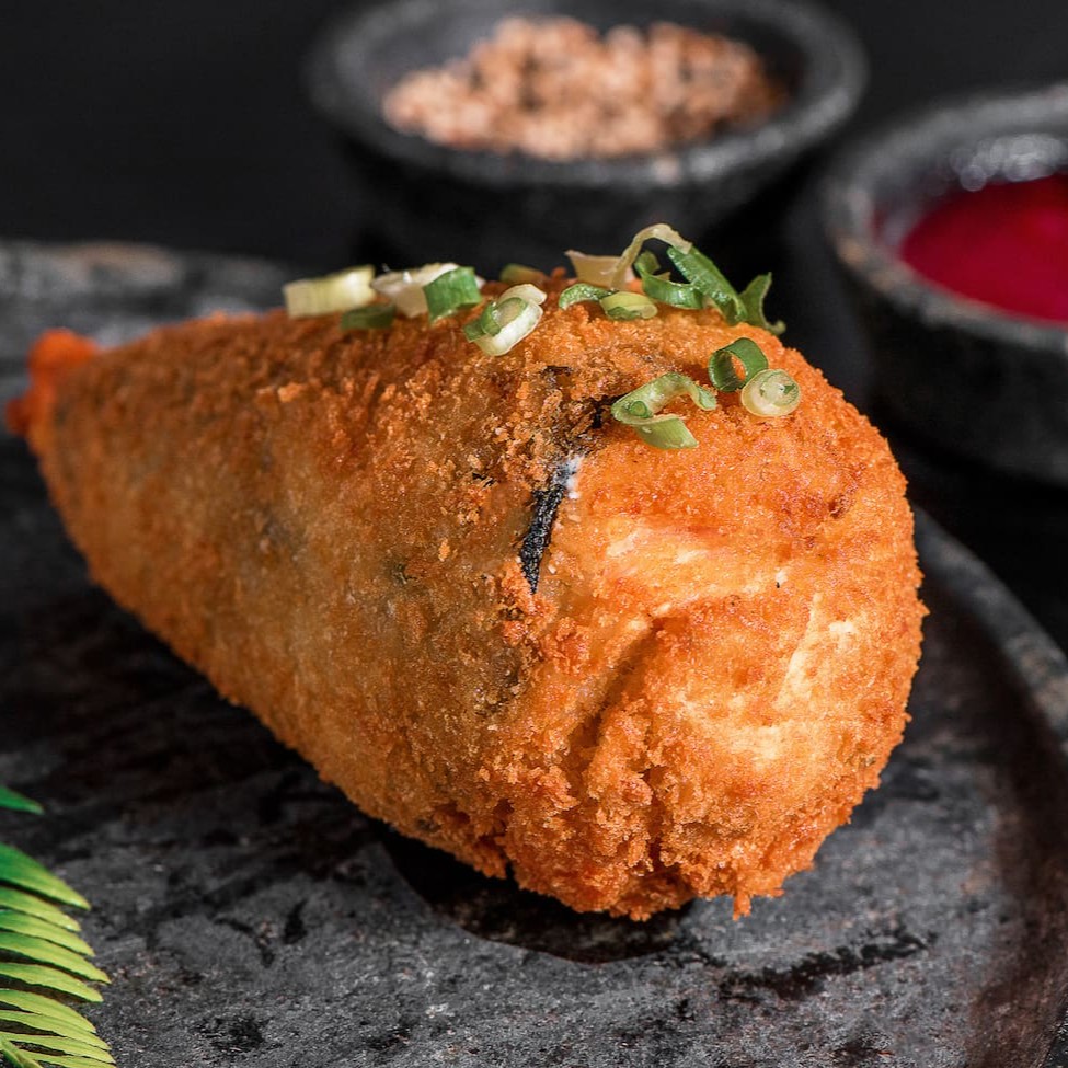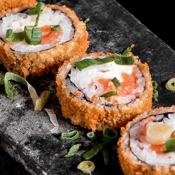 Arroz, salmão, cream cheese e cebolinha, empanado na farinha panko e frito.