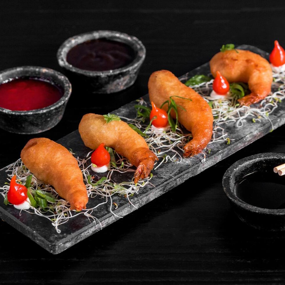 Salmão recheado com camarão, cream cheese e cebolinha, empanado na farinha panko e frito.