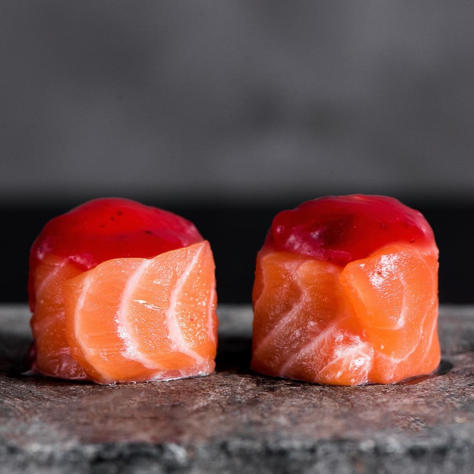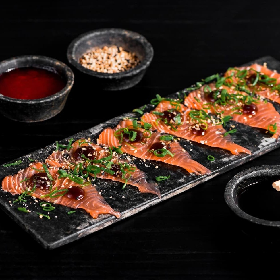 Salmão marinado no shoyu, wasabi e tempero do chef.