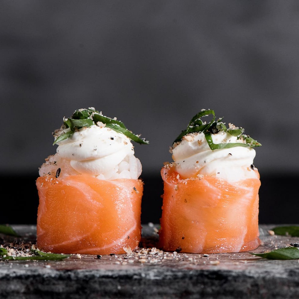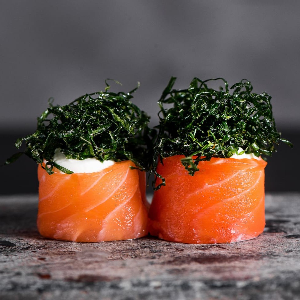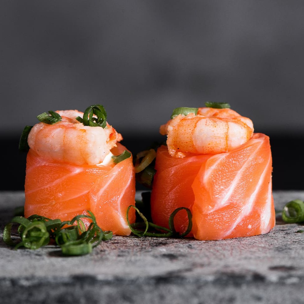 Enrolado de arroz, salmão e cebolinha.
