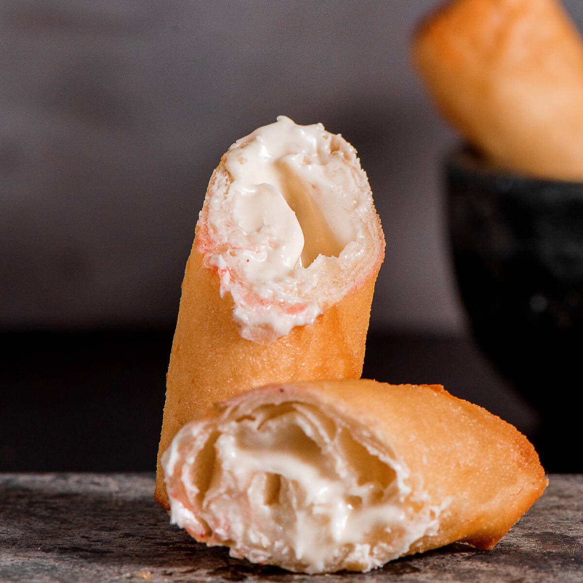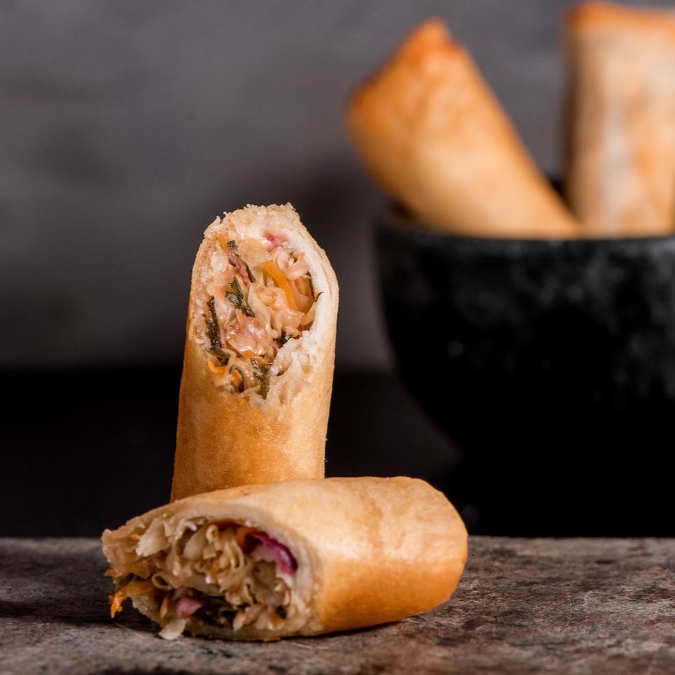 Rolinho primavera recheado com frango e cream cheese e cebolinha.