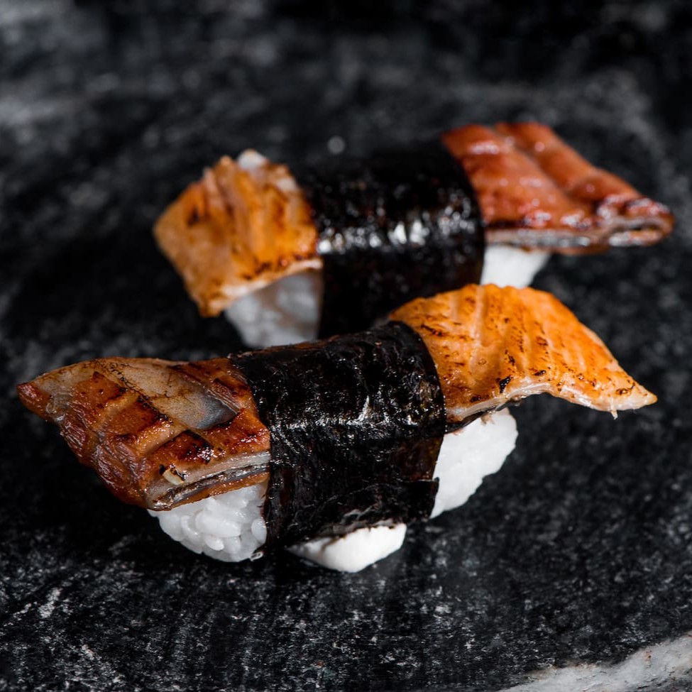 (alga, arroz e pele de salmão grelhada)