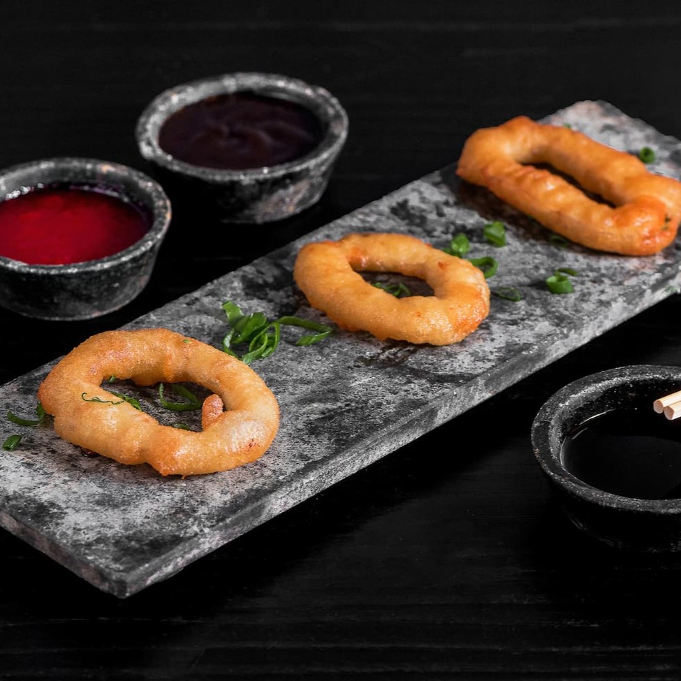 Anéis de lula temperada e empanada.