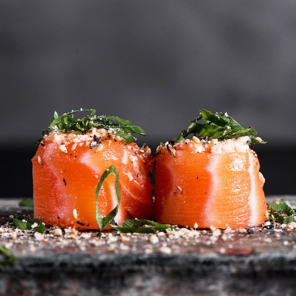 Lâminas de salmão finalizado com azeite trufado e raspas de limão.