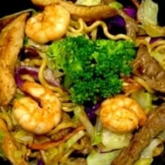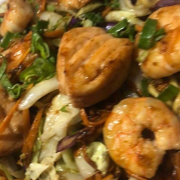 Camarão, Macarao acelga , repolho verde ,repolho roxo ,cenoura ,brócolis cebolinha Molho especial